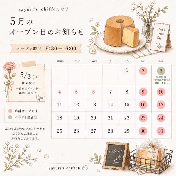 5/3(日)は、一宮の本町にて、「杜の宮市」に出店致します。Sayuri’s chiffonのショップは、お休みさせて頂きます。